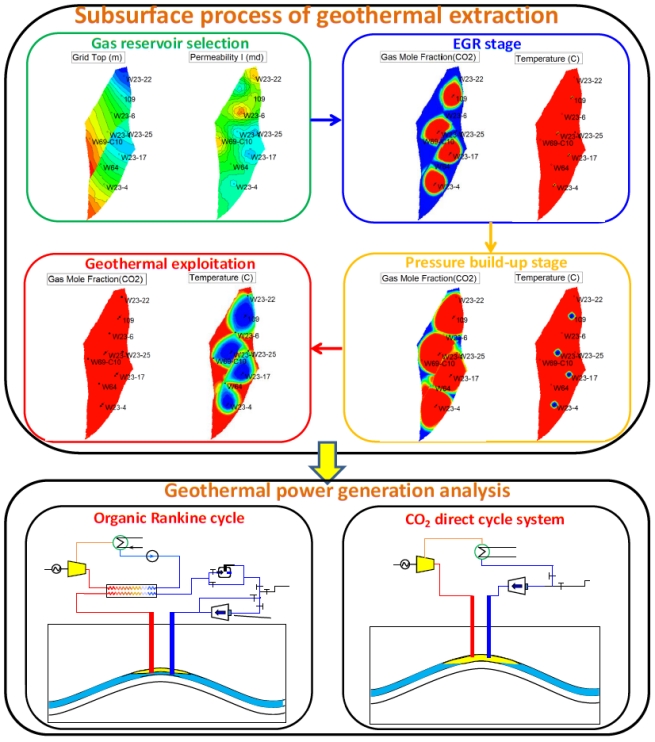 基于CO2资源化利用角度,崔国栋副教授团队将地热开发与CO2地质封存相结合,针对具有丰富地热资源的废弃油气藏,提出了注CO2提高采收率-地热开发-地质封存三位一体的CCUS技术,并对CO2在储层-井筒-地面的流动换热进行了全过程分析。首先根据实际高温废弃气田建立了地热开发模型,分析了储层CO2渗流换热规律;随后基于储层-井筒流动换热结果,提出了有机朗肯循环和CO2直接循环发电方式,对发电热力循环过程进行了优化计算;最后采用平准化发电成本计算方法,对CO2采热发电成本进行了评价。研究结果为CO2地质封存和利用提供了切实可靠的技术,助力我国绿色低碳发展。
