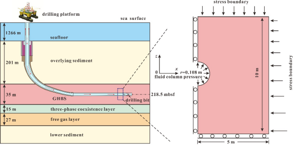 鉴于此,中国地质大学(武汉)安博游戏宁伏龙教授团队根据南海神狐海域第一次试采站位的地质资料,构建了水合物储层水平井钻进状态模型(图1)。详细研究了不同钻井液性能、水合物饱和度以及束缚水饱和度对钻进过程中井筒状态的影响规律。并在此基础上,讨论了井筒内二次水合物生成的潜在区域以及低渗泥皮形成对井壁稳定的影响。
