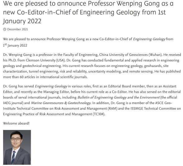 (通讯员:黄静)近日,安博游戏龚文平教授受邀担任国际期刊Engineering Geology共同主编(Co-Editor-in-Chief)。龚文平教授的此次任职将有助于促进我校在工程地质相关领域与国内外学者的交流合作,并提升我校在工程地质相关领域的国际影响力。