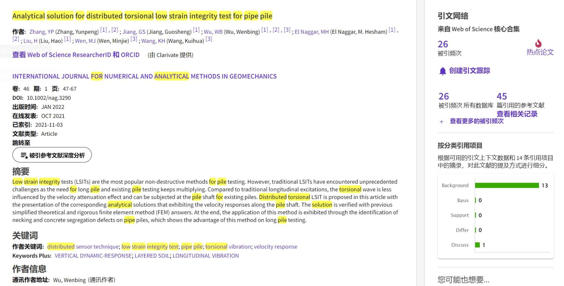 (通讯员 黄静)根据2022年9月基本科学指标数据库(Essential Science Indicators,简称ESI)最新数据显示,安博游戏勘察与基础工程系吴文兵教授团队于2021年在国际岩土工程数值计算权威期刊International Journal for Numerical and Analytical Methods in Geomechanics上发表的学术论文“Analytical solution for distributed torsional low strain integrity test for pipe pile”入选ESI热点论文(Hot Paper)。该论文第一作者为2020级博士研究生张云鹏,通讯作者为吴文兵教授,中国地质大学(武汉)安博游戏为第一署名单位。