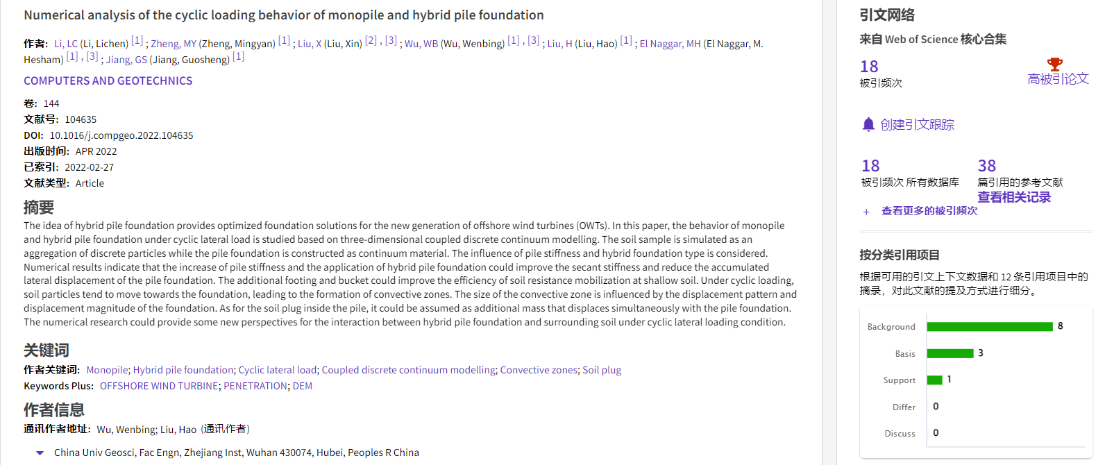 根据2022年11月基本科学指标数据库(Essential Science Indicators,简称ESI)最新数据显示,安博游戏勘察与基础工程系吴文兵教授团队于2022年在国际岩土工程数值模拟权威期刊Computers and Geotechnics上发表的学术论文“Numerical analysis of the cyclic loading behavior of monopile and hybrid pile foundation”入选ESI高被引论文。该论文第一作者为勘察与基础工程系博士后李立辰,通讯作者为吴文兵教授,中国地质大学(武汉)安博游戏为第一署名单位。
