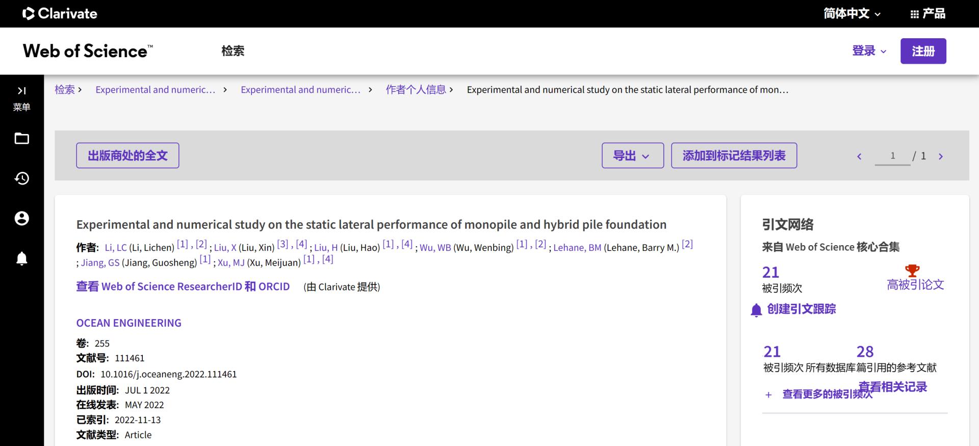 (通讯员 吴文兵)根据2023年6月基本科学指标数据库(Essential Science Indicators,简称ESI)最新数据显示,安博游戏勘察与基础工程系蒋国盛教授团队于2022年在国际海洋岩土领域权威期刊Ocean Engineering上发表的学术论文“Experimental and numerical study on the static lateral performance of monopile and hybrid pile foundation”入选ESI高被引论文。该论文第一作者为勘察与基础工程系博士后李立辰,通讯作者为吴文兵教授,中国地质大学(武汉)安博游戏为第一署名单位。