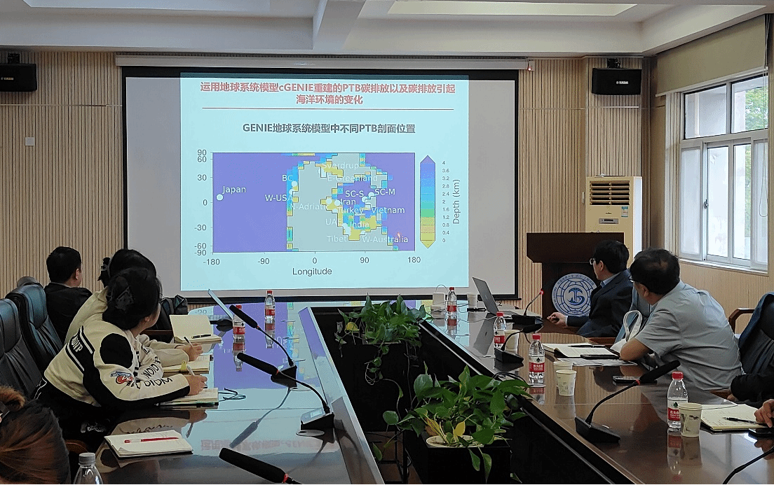 张飞飞教授以“地球深部碳排放与浅表环境响应”为主题展开学术报告,针对碳排放究竟对海洋环境有何影响这一问题,以史为鉴,研究了二叠-三叠纪之交(PTB)和古新世-始新世之交(PETM)两次由巨量碳排放触发的极热气候事件对海洋环境和海洋生态系统的影响机制,运用地球系统模型cGENIE重建了PTB碳排放引起海洋环境的变化,发现海洋缺氧程度受控于碳排放速率和总量,而现代碳排放速率远远大于历史上两次增温事件。最后,张飞飞教授以历史规律为参考,评估了地球宜居现状和未来全球气候变化。
